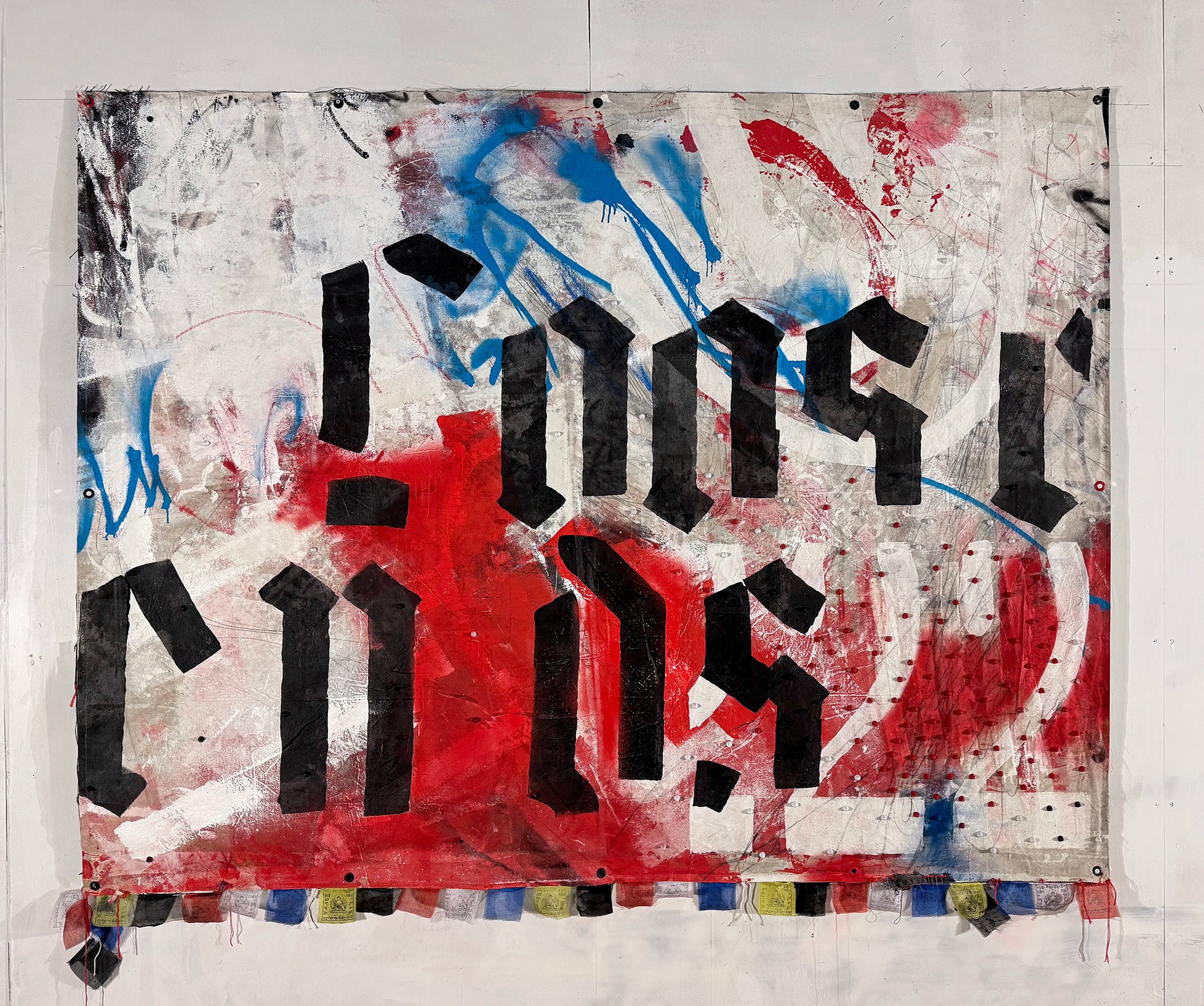 Tapestry made with spraypaint, acrylic, graphite, oil stick, hand dyed jersey cotton cord, deconstructed denim, prayer flags, enameled metal studs & rivets, on a studio drop cloth sewn onto a heavyweight black canvas backing.